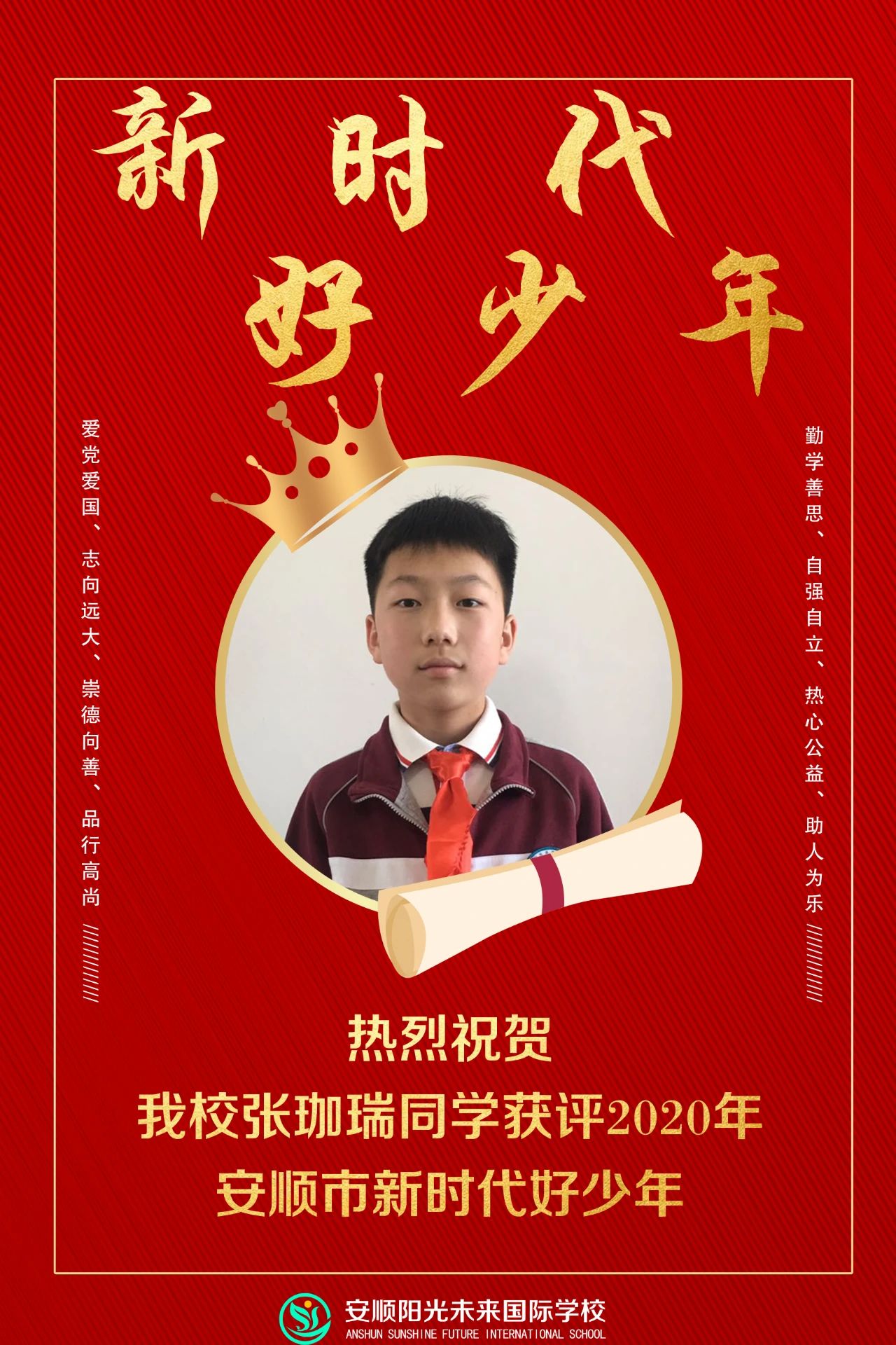 此次“新時代好少年”評選活動以培育和踐行社會主義核心價值觀為主線,以“扣好人生第一??圩?rdquo;為主題,尋找的是有著:愛黨愛國、志向遠大;崇德向善、品行高尚;勤學(xué)善思、自強自立;熱心公益、助人為樂等良好品質(zhì)的新時代優(yōu)秀少年。 為廣大未成年人樹立可親可敬可學(xué)的榜樣,示范引領(lǐng)青少年向上向善,努力成長為德智體美勞全面發(fā)展、擔(dān)當(dāng)民族復(fù)興大任的時代新人。 經(jīng)過層層選拔,最終來自六年級一班的張珈瑞同學(xué)獲得了安順陽光未來學(xué)校校級新時代好少年稱號,并在安順各學(xué)校間的評比中,榮獲: 安順市2020年度新時代好少年稱號
