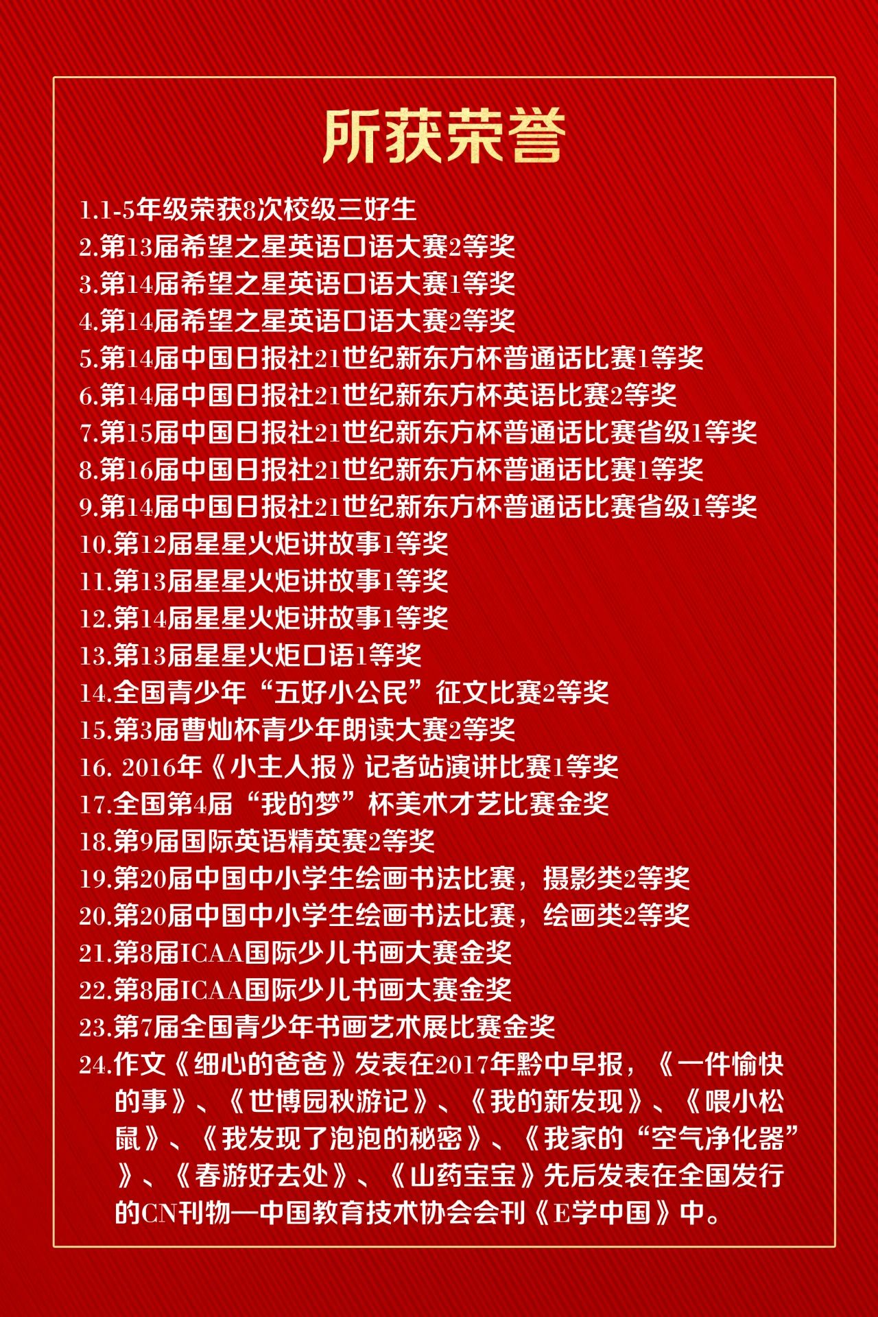 張珈瑞,男,出生于2008年5月,先就讀于安順陽光未來學(xué)校小學(xué)部六年級一班。在學(xué)習(xí)上,他努力刻苦,成績優(yōu)異;在生活中,他樂于助人,團結(jié)同學(xué)。雖然年紀不大,但他已經(jīng)通過自己的努力,取得了很多的榮譽。