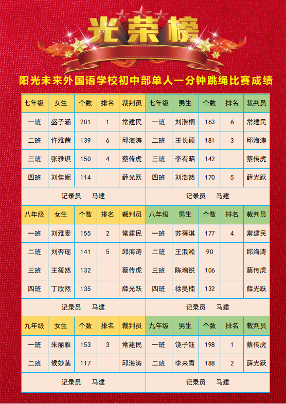 我們一起來看看同學(xué)們在短短的幾天訓(xùn)練之后的戰(zhàn)績吧!相信一個月后的比賽一定會更加精彩,學(xué)生們的成績一定會更加卓越! 八字跳繩賽