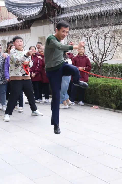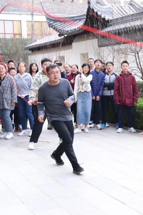 在裁判長的一聲“開始”令下,比賽開始了。老師們爭分奪秒地開始跳了起來,年輕教師活力充沛,中年教師也不甘落后。褪去課堂上嚴(yán)師的形象,走下講臺來到跳繩比賽場上,老師們各顯“繩”通。只見他們一個個使出渾身的解數(shù),緊握跳繩,繩子飛快地越過頭頂,在空中飛舞,此起彼伏。老師們隨著繩子的起落輕盈跳躍,笑聲與汗水一同揮灑,整個比賽現(xiàn)場成為了一片歡騰的海洋。