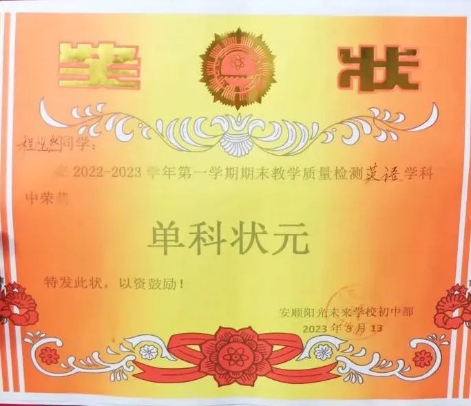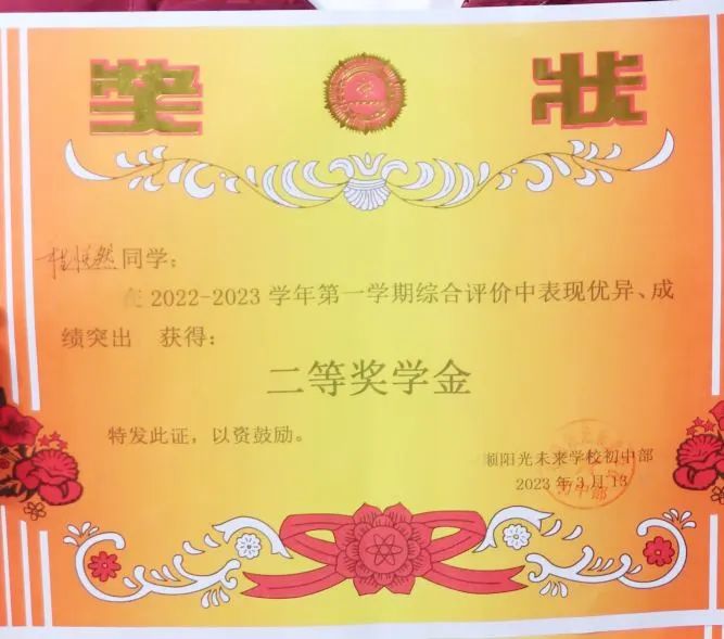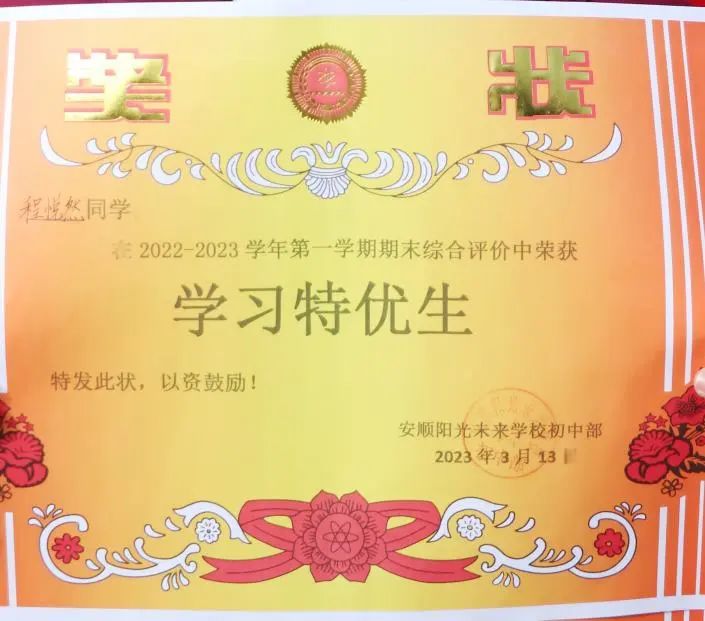 (程悅?cè)慌c父親) 民族的復(fù)興是奮斗出來(lái)的,幸福的生活也是奮斗出來(lái)的,一切的成就和幸福都源自于勞動(dòng)和創(chuàng)造,都要靠過(guò)硬的本領(lǐng)。 程悅?cè)粡男W(xué)一年級(jí)開始,多次獲得校級(jí)三好學(xué)生、年級(jí)前十、學(xué)習(xí)標(biāo)兵,上初中后,拿到過(guò)大大小小各種獎(jiǎng)項(xiàng),如年級(jí)學(xué)習(xí)之星、學(xué)習(xí)特優(yōu)生、單科狀元、校級(jí)獎(jiǎng)學(xué)金,各種征文比賽,一、二、三等獎(jiǎng)。