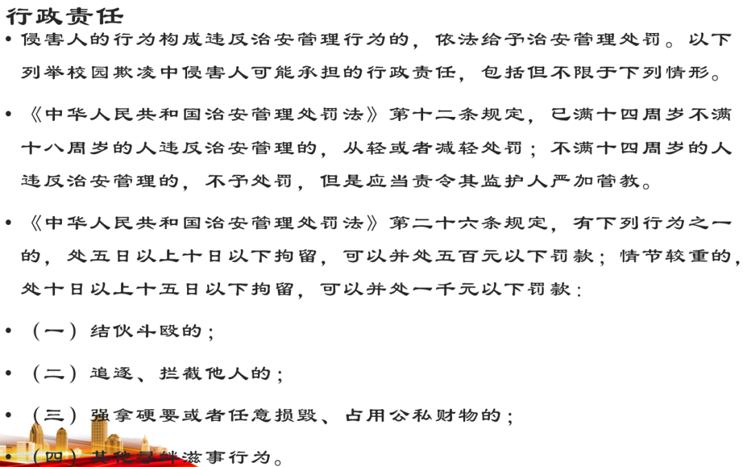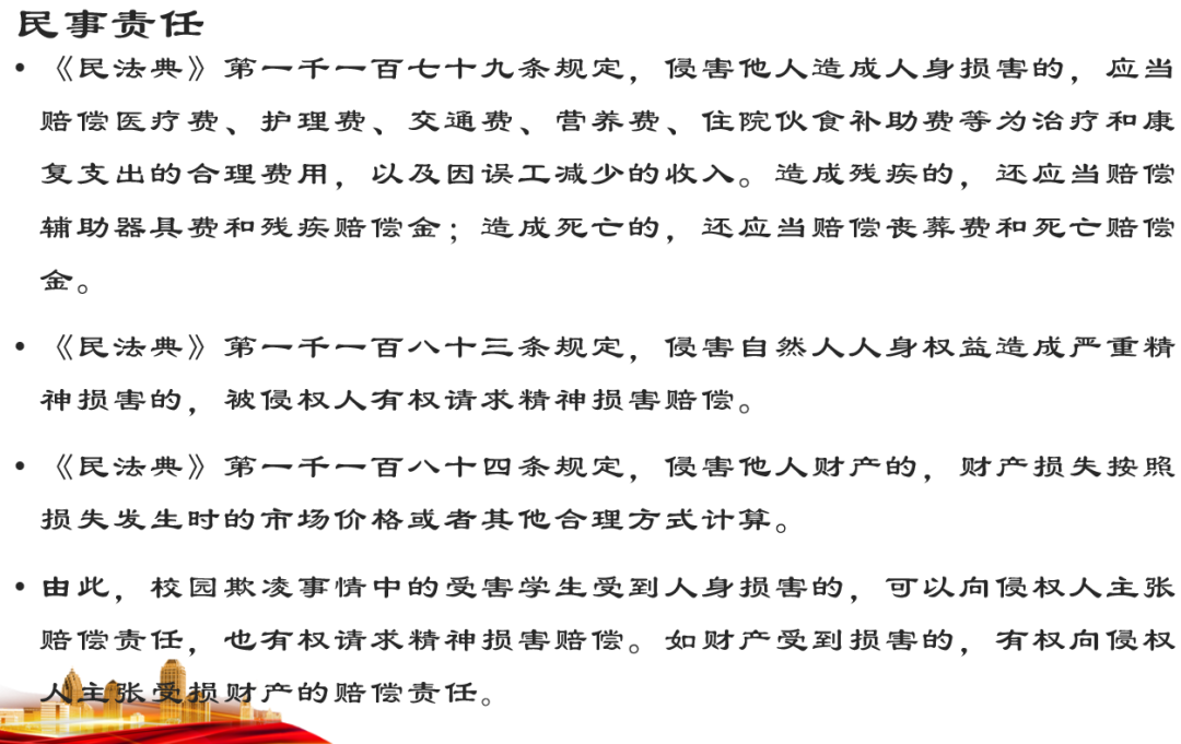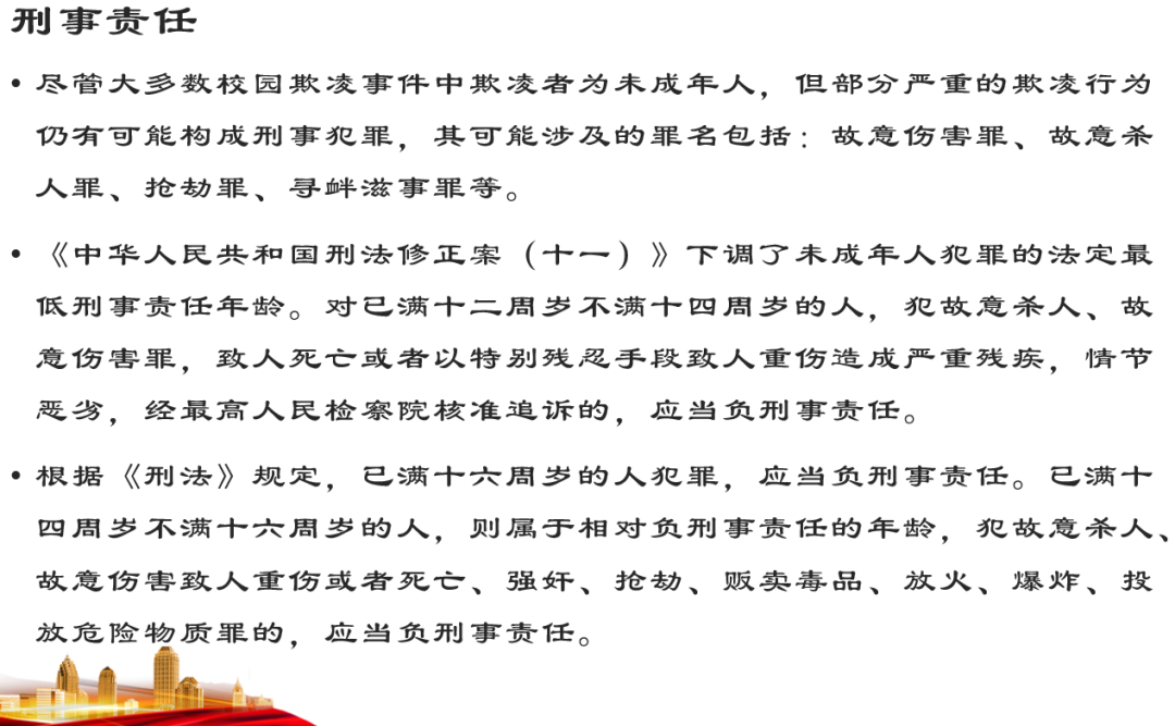 東野圭吾的小說《惡意》中,當校園霸凌的施暴者被問到為什么只欺負這個孩子時,他們說:“沒什么原因,就是看他不爽而已。” 但同學們是否知道這已構成欺凌行為? 欺凌事件發(fā)生時,受欺凌者往往處于弱勢地位而無力保護自己,不僅身體受到傷害,心理也會更加敏感、猜疑,情緒抑郁,變得膽怯、畏縮、孤僻,導致學習困難、厭學逃學。 欺凌者在給受欺凌者帶來直接或間接傷害的同時,自身也會遭受多方面的消極影響。如果未對欺凌行為進行適時矯正,欺凌者日后遭遇挫折和面臨困境時可能會采取極端方式解決問題。由此,校園欺凌事件中的受害學生受到人身損害時可以用以下法律條例保護自己: