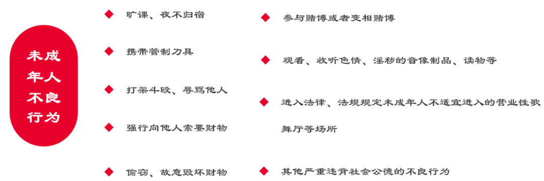未成年人應當遵守法律、法規(guī)及社會公共道德規(guī)范,樹立自尊、自律自強意識,增強辨別是非和自我保護的能力,自覺抵制各種不良行為及違法犯罪行為的引誘和侵害, 遵守預防未成年人犯罪法。 本法所稱不良行為,是指未成年人實施的不利于其健康成長的下列行為: