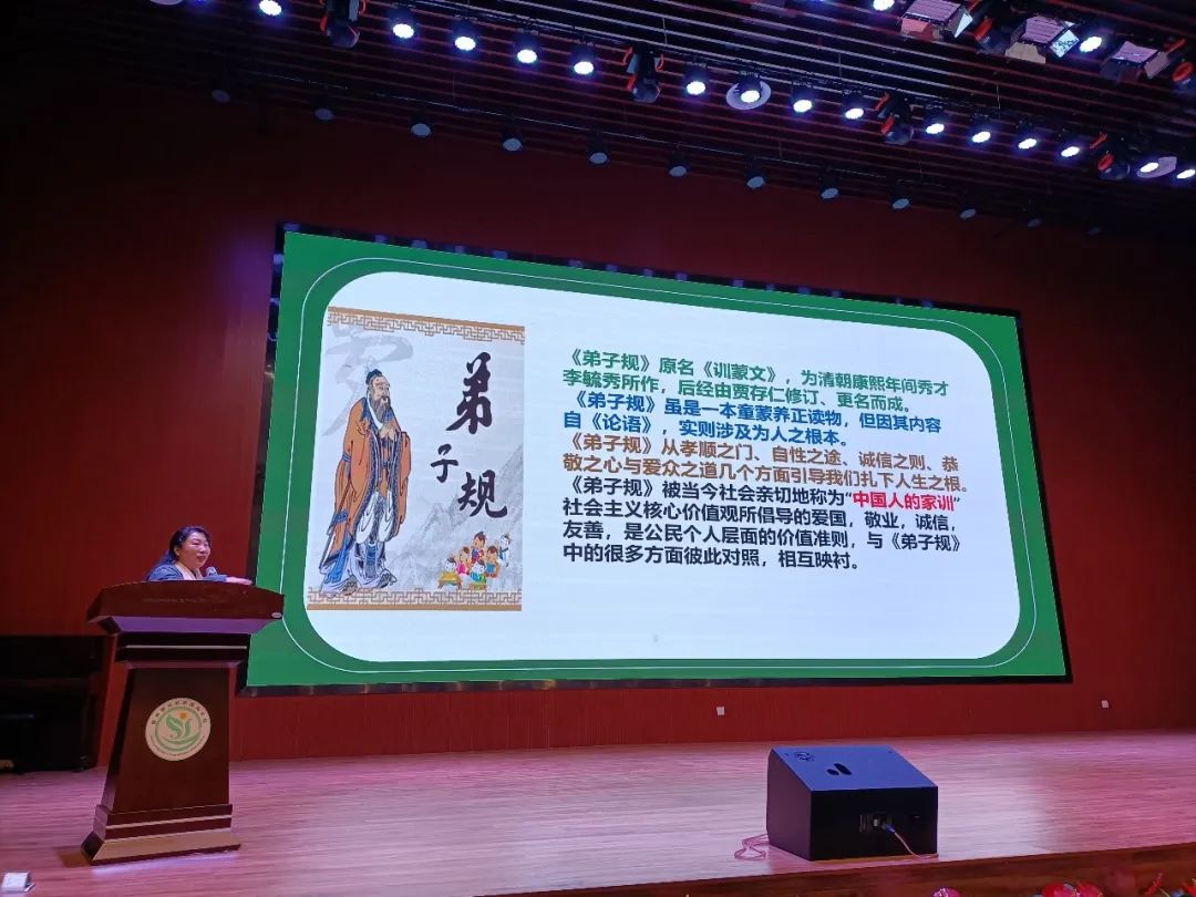 在經(jīng)典文學(xué)中趙老師解讀《弟子規(guī)》令在座教師對《弟子規(guī)》有了深刻認(rèn)識(shí)?!兜茏右?guī)》原名《訓(xùn)蒙文》,為清朝康熙年間秀才李毓秀所作,后經(jīng)由賈存仁修訂、更名而成?!兜茏右?guī)》雖是一本童蒙養(yǎng)正讀物,但因其內(nèi)容自《論語》,實(shí)則涉及之根本?!兜茏右?guī)》從孝順之門、自性之途、誠信之則、恭敬之心與愛眾之道幾個(gè)方面引導(dǎo)我們扎下人生之根?!兜茏右?guī)》被當(dāng)今社會(huì)親切地稱為“中國人的家訓(xùn)”社會(huì)主義核心價(jià)值觀所倡導(dǎo)的愛國,敬業(yè),誠信,友善是公民個(gè)人層面的價(jià)值準(zhǔn)則,與《弟子規(guī)》中的很多方面彼此對照,相互映襯。
