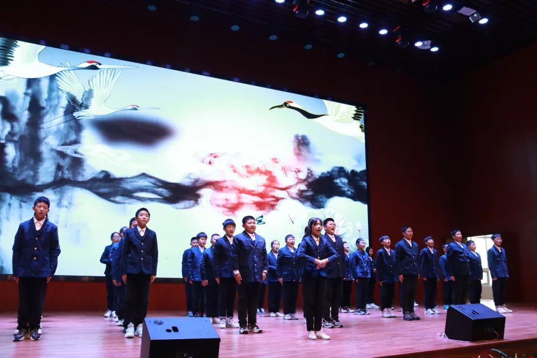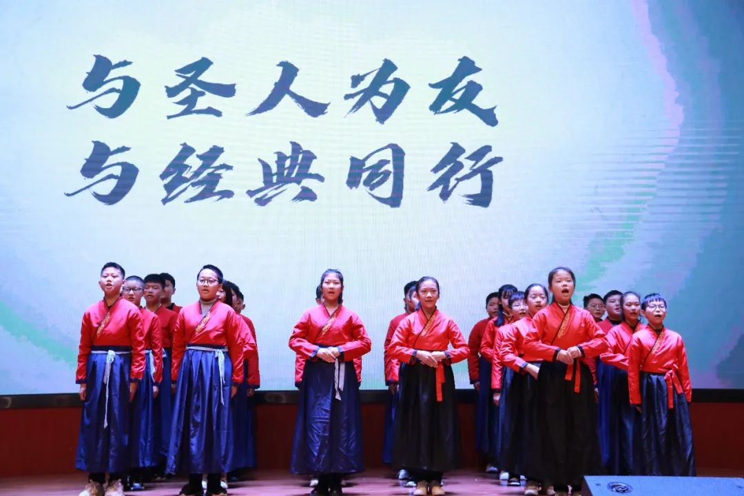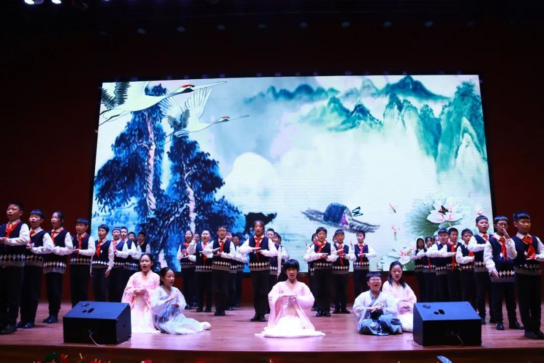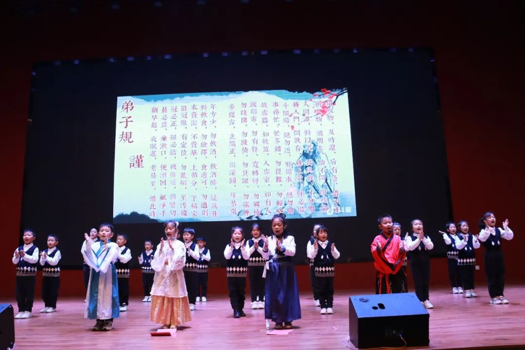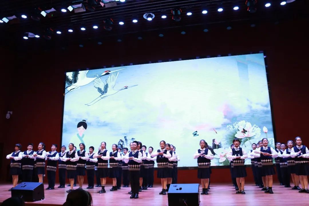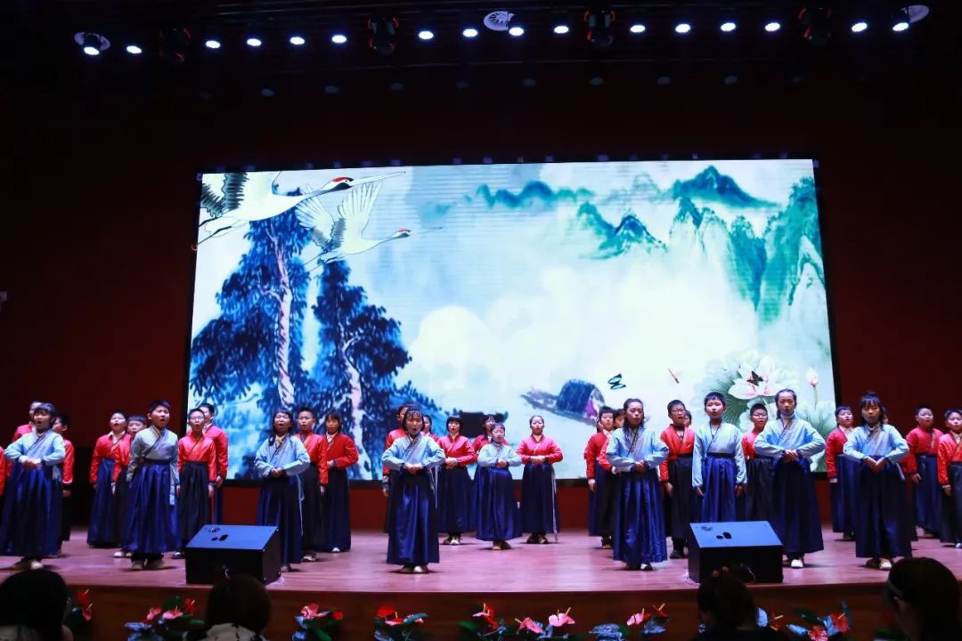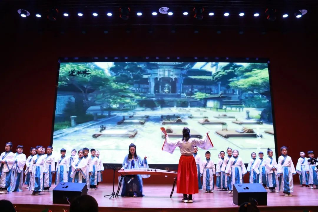 一年級(jí)(1)班 《弟子規(guī)》——信 古詩《詠鵝》 在上場時(shí)口號(hào)響亮整齊,他們的朗誦加入了自己的創(chuàng)作創(chuàng)新,老師和每位孩子都穿上了古色古香的漢服,仿佛穿越了時(shí)空。在古箏行云流水的旋律之間與朗朗誦讀聲結(jié)合在一起相得益彰!贏得場內(nèi)熱烈掌聲!