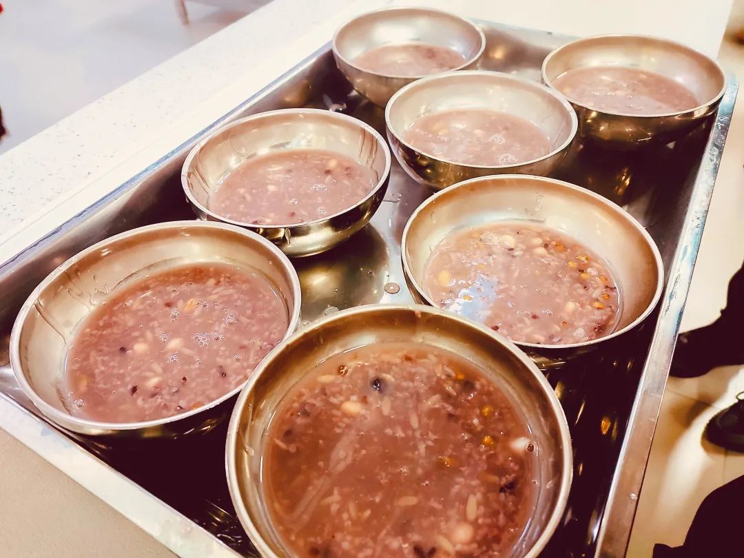 學(xué)校食堂工作人員將提前開始準(zhǔn)備煮粥所需的材料,紅棗、紅豆、花生、綠豆、桂圓、蓮子等配料,經(jīng)過挑選、淘洗、浸泡等多道工序之后上鍋開煮。食堂李師傅說,臘八粥不同于別的粥,由于食材多,需要慢慢熬制,熬制期間慢慢攪動,這樣熬粥才好吃。