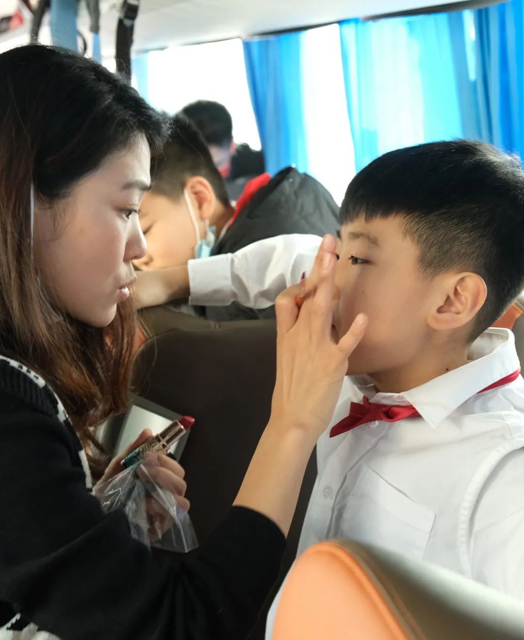 因為人數(shù)眾多,在時間非常緊張的狀況下,我們的藝體女老師們在路上就開始給同學(xué)們開始化妝打底了?;脢y的同學(xué)們變得更加眉清目秀了、英姿颯爽了!有一個扮演小戰(zhàn)士的“小蘿卜頭”扮演者李嘉祺,他告訴化妝的老師說要自己的臉要涂的黑黑的,他扮演的“小蘿卜頭”是一個抗戰(zhàn)的小戰(zhàn)士,被敵人拘禁,最后英勇犧牲,臉上不能太干凈。李佳琪同學(xué)絲毫不介意自己的面容被涂的黑黑的,他說演出要符合節(jié)目內(nèi)容的需要。同學(xué)們也為他的尊重角色的需要而奉獻自己的精神點贊!