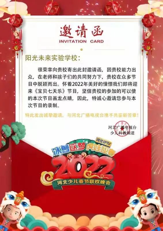 “河北少兒春晚”是河北廣播電視臺少兒科教頻道的優(yōu)秀品牌活動,“2022年河北少兒春晚”將在傳承品牌既有優(yōu)勢的基礎(chǔ)上,進(jìn)一步擴(kuò)大規(guī)模、提升品質(zhì),面向全省通過城市賽、決賽,甄選優(yōu)秀少兒文藝節(jié)目,并推出大型晚會“2022河北少兒春晚”。