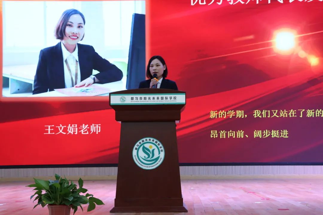 一年級班主任王文娟作為優(yōu)秀教師代表發(fā)言,她談到,作為一名老師,我們刻苦鉆研、嚴(yán)謹(jǐn)治學(xué),我們是知識的重要傳播者和創(chuàng)造者。當(dāng)今時(shí)代知識層出不窮,要成為合格的教育者,我們必須不斷學(xué)習(xí),不斷充實(shí)自己、革新自己。新的學(xué)期,新的起點(diǎn),新的希望!這一年我們?nèi)w老師將繼續(xù)以高度的責(zé)任感和使命感,開拓進(jìn)取、扎實(shí)工作,用愛心感染愛心,用智慧啟迪智慧,以人格感召人格,奮力書寫陽光教育教學(xué)工作的新篇章! 董校致辭