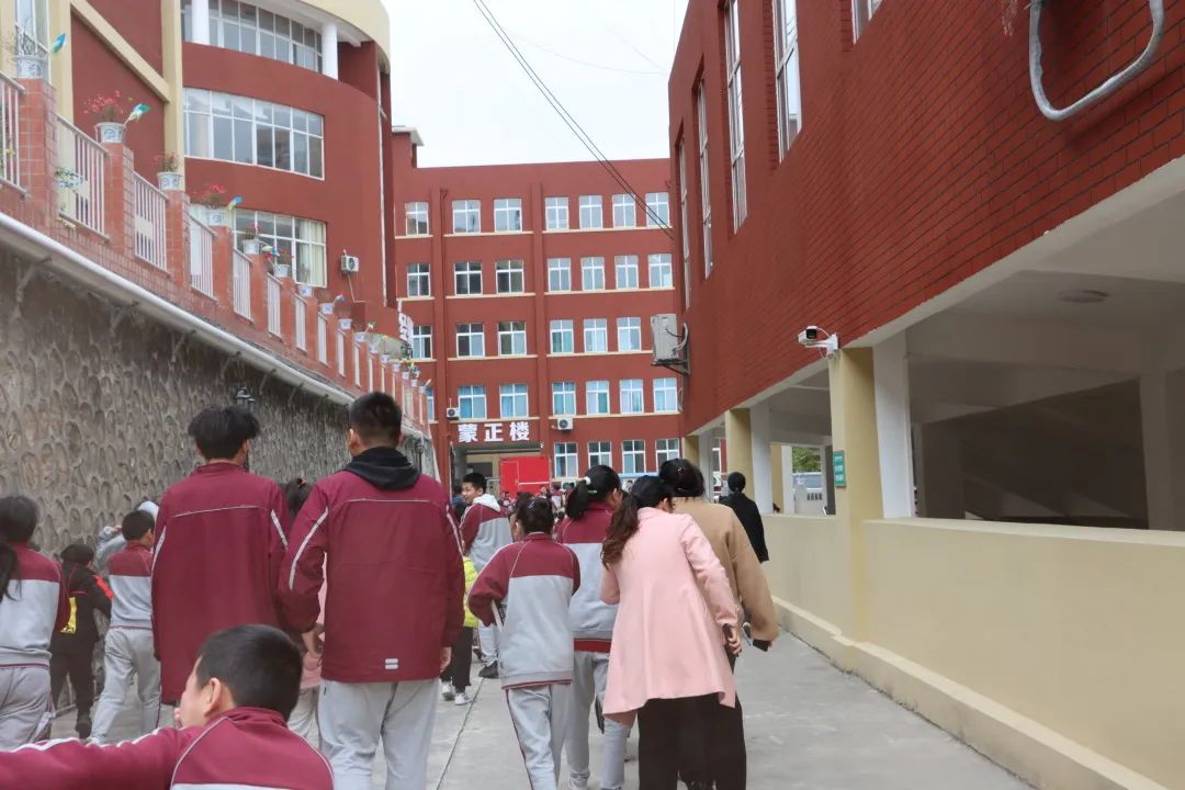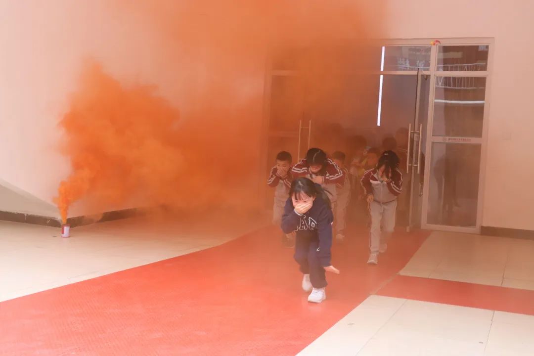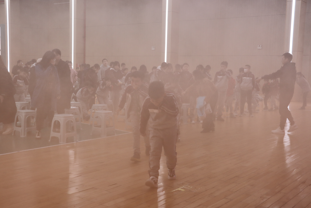 講座結(jié)束后,全校師生立即進(jìn)行了一次火災(zāi)疏散逃生演練。隨著一陣迷霧濃煙的出現(xiàn)和警報(bào)聲的響起,同學(xué)們?cè)诶蠋煹闹笓]下用手捂住口鼻,彎腰低姿沿著安全出口標(biāo)識(shí)迅速撤離,有序到達(dá)安全地帶。