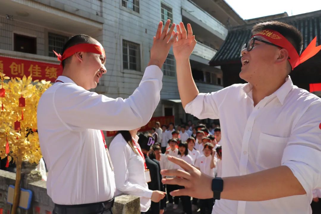 學(xué)子們與老師們相互擊掌,將寫有自己祝福許愿牌掛在許愿樹上,寓意6月高中。