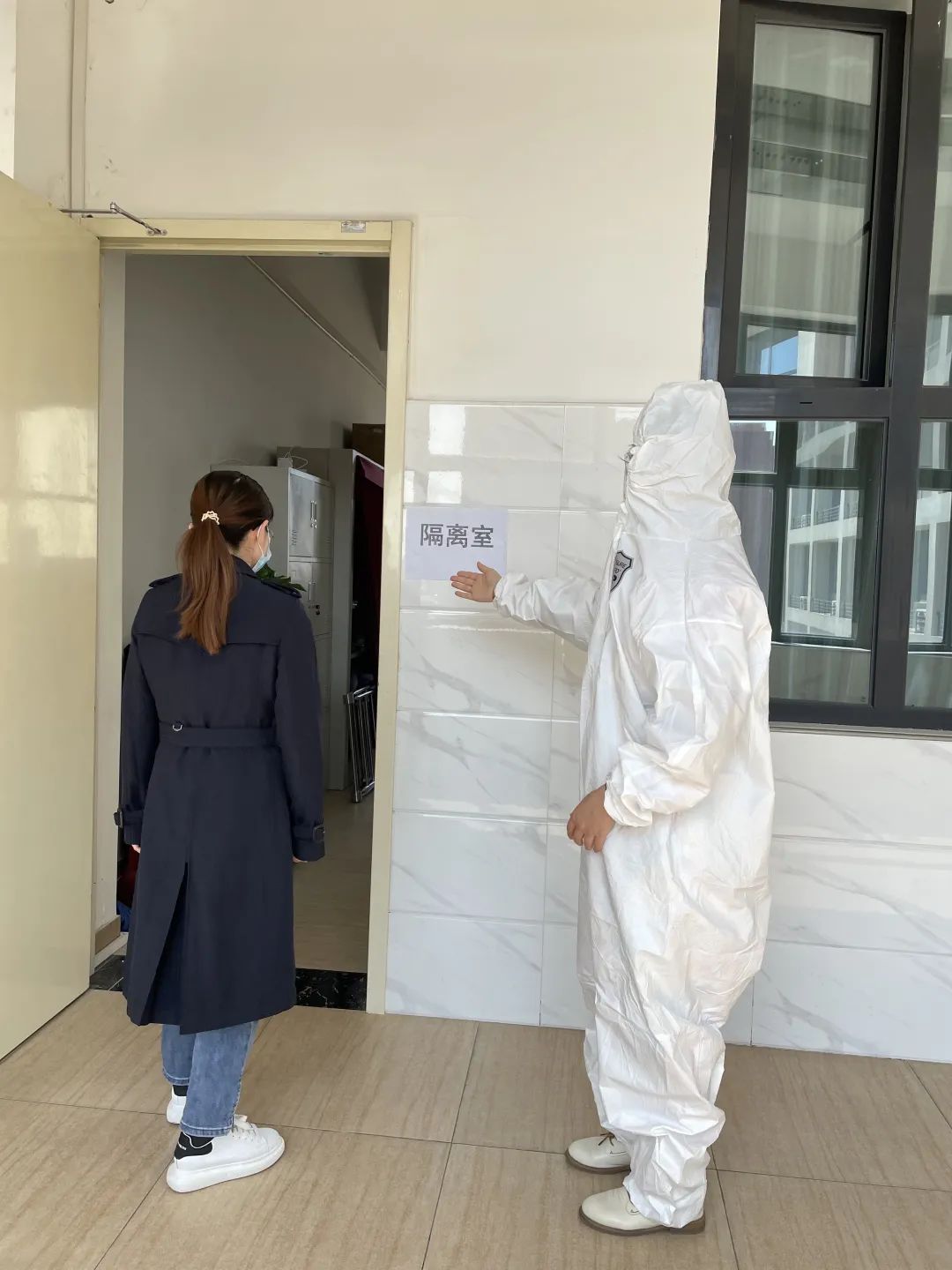 發(fā)熱學生轉移至空曠處等待,校醫(yī)穿著防護服將體溫異常的學生帶入隔離室,進行進一步檢查。