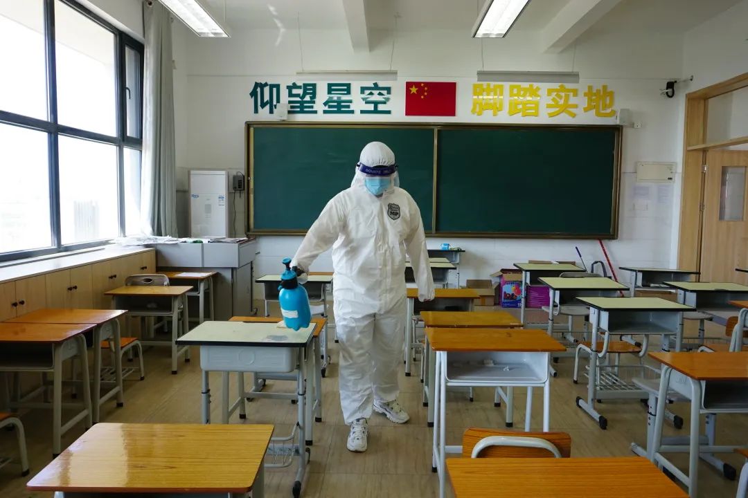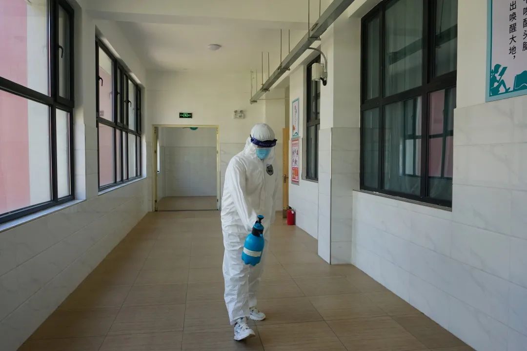 消毒防疫組成員對出現疫情癥狀學生經過的通道及該生可能接觸過的物品進行應急消毒。
