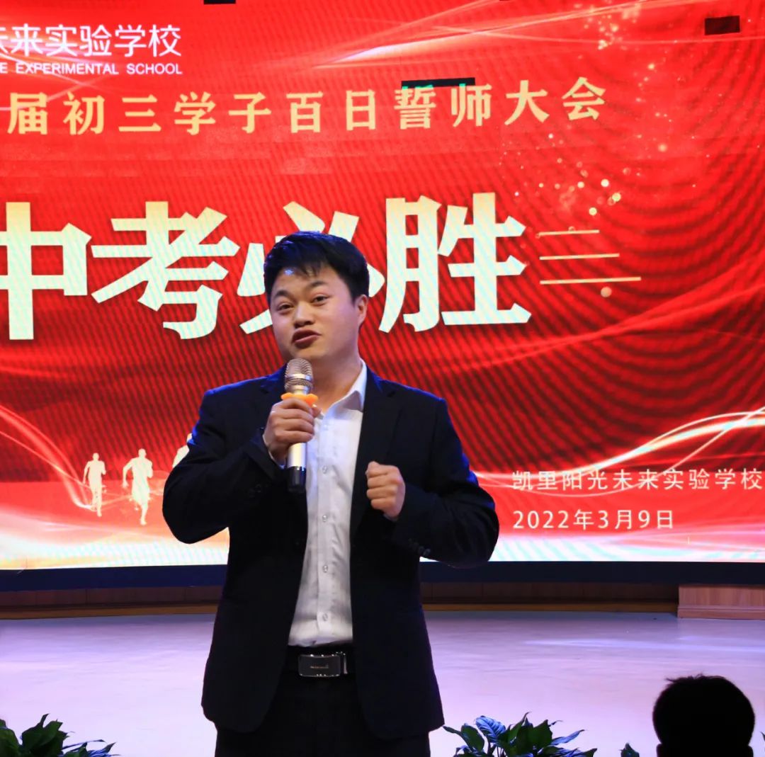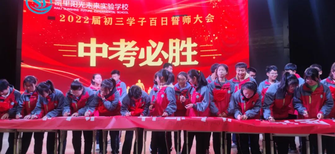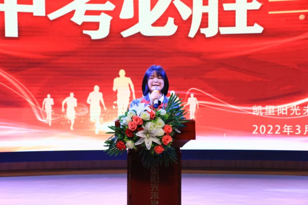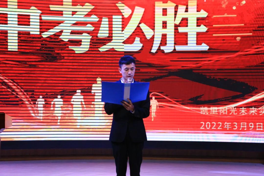 3月9日上午,凱里市陽(yáng)光未來(lái)實(shí)驗(yàn)學(xué)校2022屆中考誓師大會(huì)在學(xué)校報(bào)告廳正式舉行,初三全體師生出席大會(huì),為百天沖刺吹響號(hào)角,為決戰(zhàn)中考吶喊助威。
