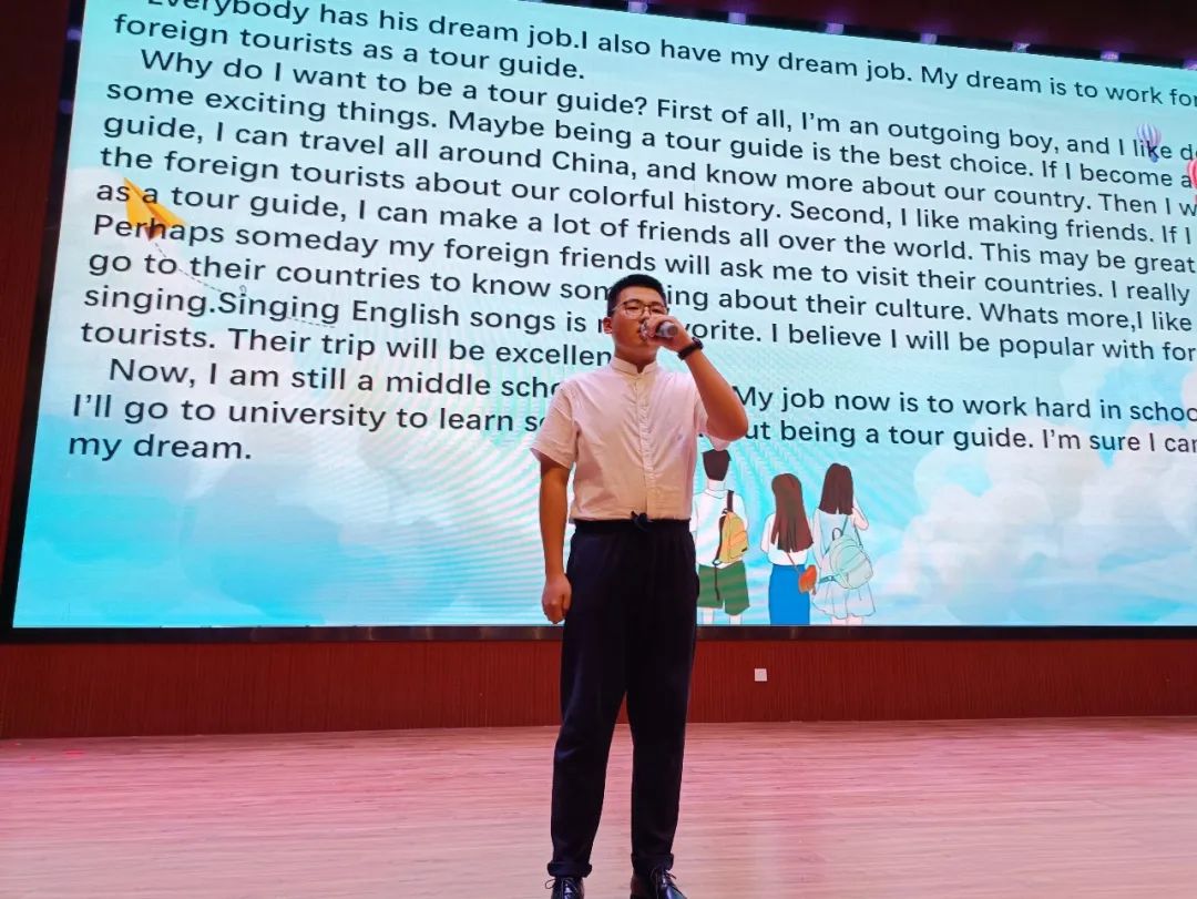 21名決賽選手依次上臺演講,形式多樣,他們時而慷慨激昂,時而低回婉轉(zhuǎn),時而歡快,時而凝重,標準流利的口語,繪聲繪色的表演,用英語流利的講述自己的夢想,為夢想而需要做出的努力,舉手投足間盡顯初中學(xué)子們的風(fēng)采。