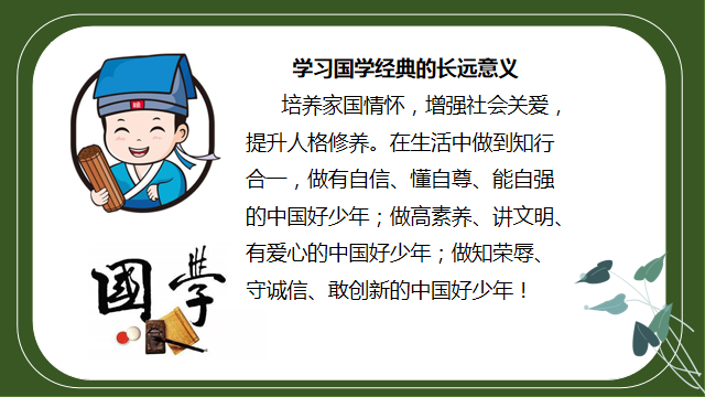 國學大師三宗牟??說:“少兒學習國學經(jīng)典是中華文化的儲蓄銀行,中華文化最好的貨幣就是經(jīng)典,在年幼時將最好的貨幣存在他們心中,他們長大后一定會知道怎么用。” 尹主任分別對《弟子規(guī)》的七個篇章進行解讀。在入則孝中,對“父母呼,應勿緩。父母命,行勿懶”進行分析,對于父母在叫自己的時候要立即答應,不能遲緩;父母讓做的時候,要馬上去做,不能拖延。“親所好,力為具”、“親所惡,謹為去”讓同學們謹記,這是一把無形的尺子,凡是父母所喜歡的東西,一定要盡力的替他們準備好;凡是父母所討厭的東西,一定要小心地處理掉。 尹主任通過講解學習國學經(jīng)典的好處和長遠意義,來引導學生們?yōu)槭裁磥韺W習國學經(jīng)典。