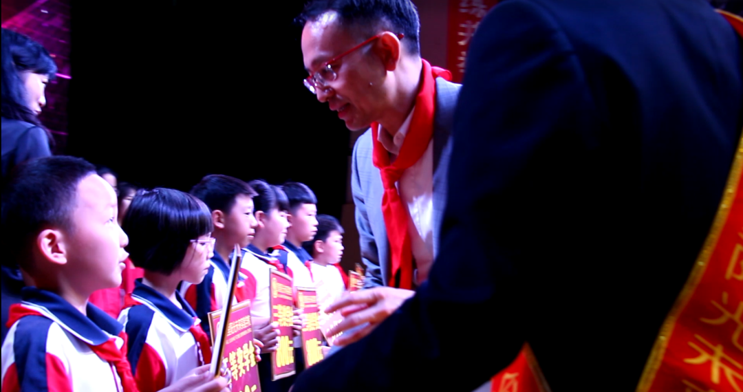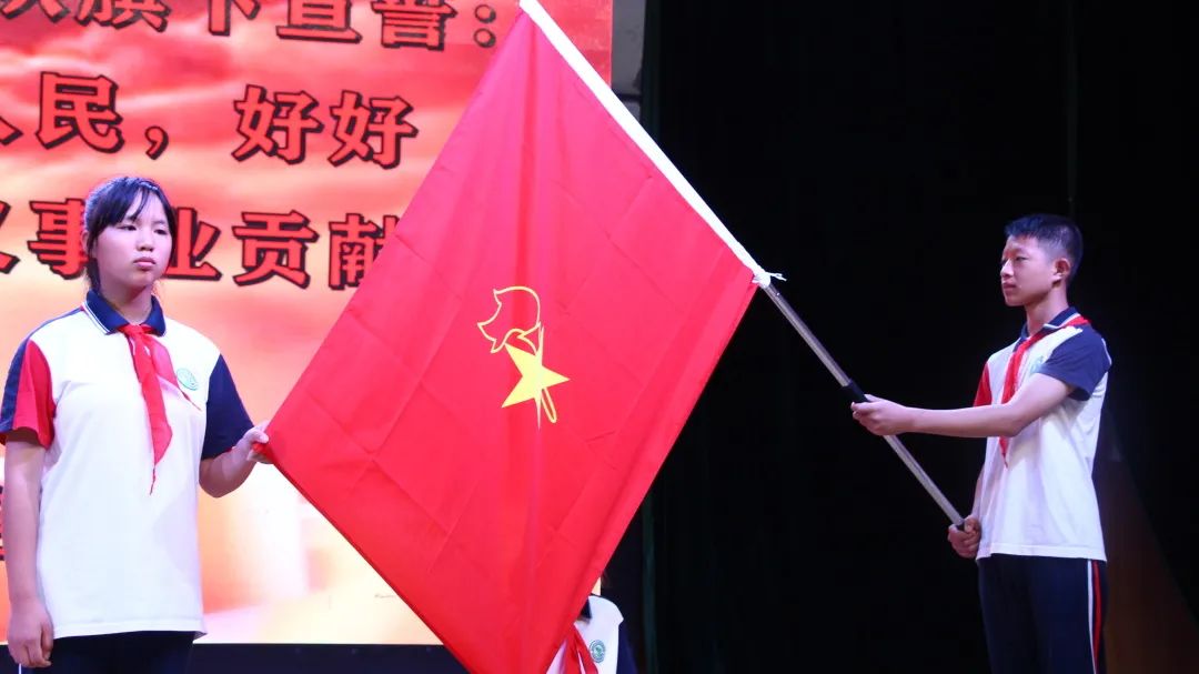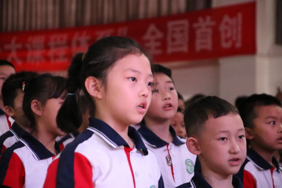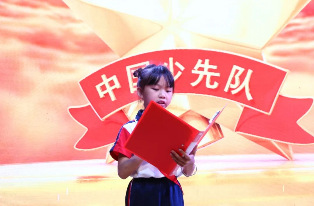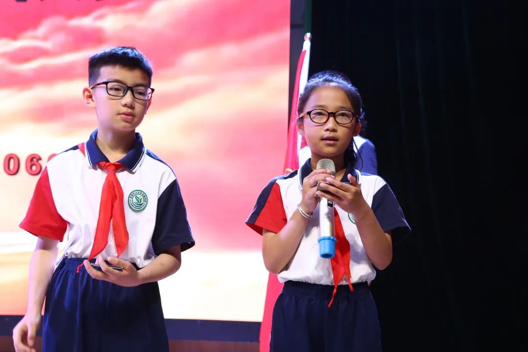 伴隨著雄壯有力的出旗曲,入隊儀式拉開序幕,全體隊員高唱《中國少年先鋒隊隊歌》,清脆嘹亮的童聲表達著孩子們的自豪和喜悅。