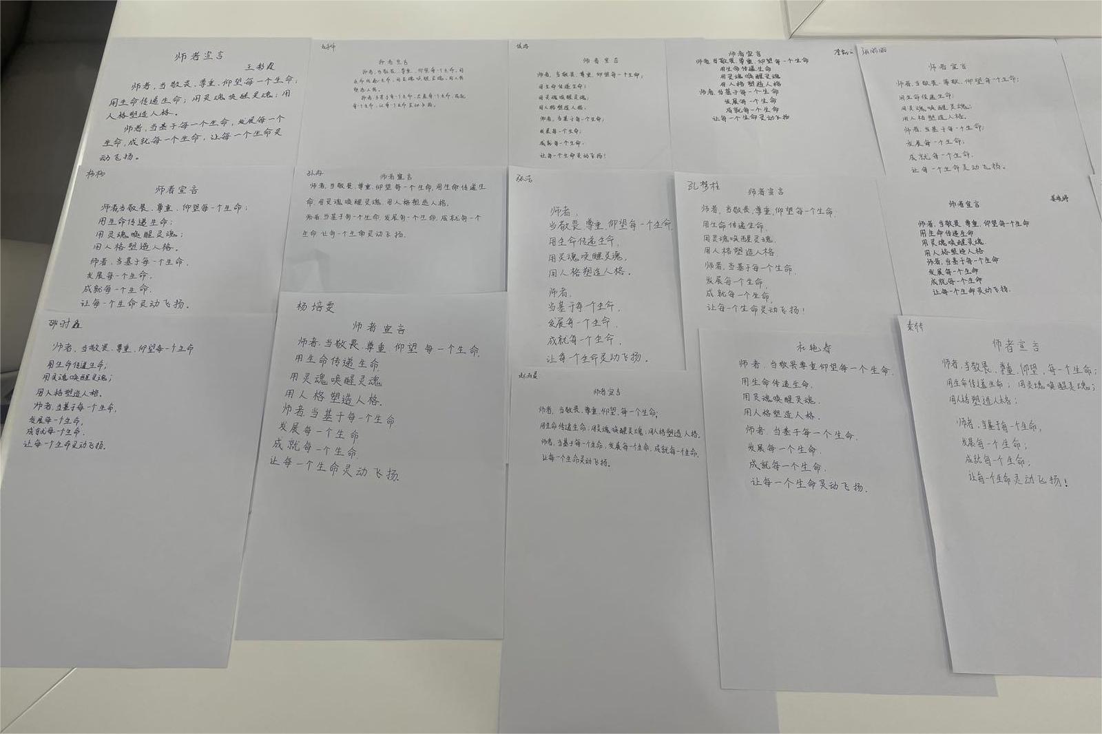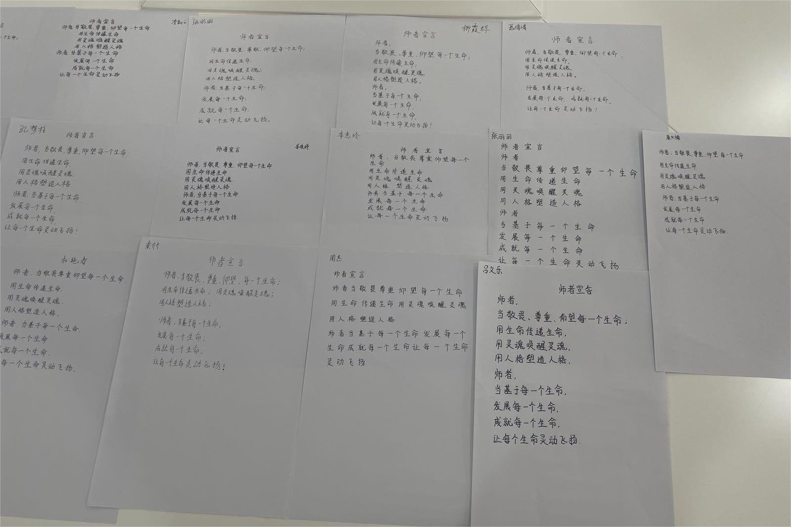 本次活動(dòng)由初中部藝體組長楊杰老師主持 抽簽決定順序 本次活動(dòng)分為演講《我的育人故事》、書法展示、即興問答、才藝展示四個(gè)環(huán)節(jié),抽簽決定老師們的順序。 我的育人故事 成長總是充滿著各種機(jī)遇,每一位班主任都分享了一個(gè)精彩的故事,每一個(gè)故事背后都有一段動(dòng)人的旋律,每一個(gè)旋律的譜寫都是一點(diǎn)一滴的付出,感人的事跡還有很多,教育的故事還有很長,充滿愛的旅程永遠(yuǎn)在繼續(xù)。 各位班主任老師創(chuàng)設(shè)積極向上的班級文化、精神文化,用潤物細(xì)無聲的愛滋潤著每一位學(xué)生的成長,對孩子的點(diǎn)滴付出成就了孩子,也成就了自己。她們始終堅(jiān)持自己的教育夢,做孩子們最堅(jiān)強(qiáng)的后盾。 書法展示 硬筆書法是中國特有的傳統(tǒng)文化,是用特有性能的書寫工具所寫出的一種線條造型藝術(shù)。選手老師們的一幅幅優(yōu)秀的書法作品令人賞心悅目,就請大家先睹為快吧……