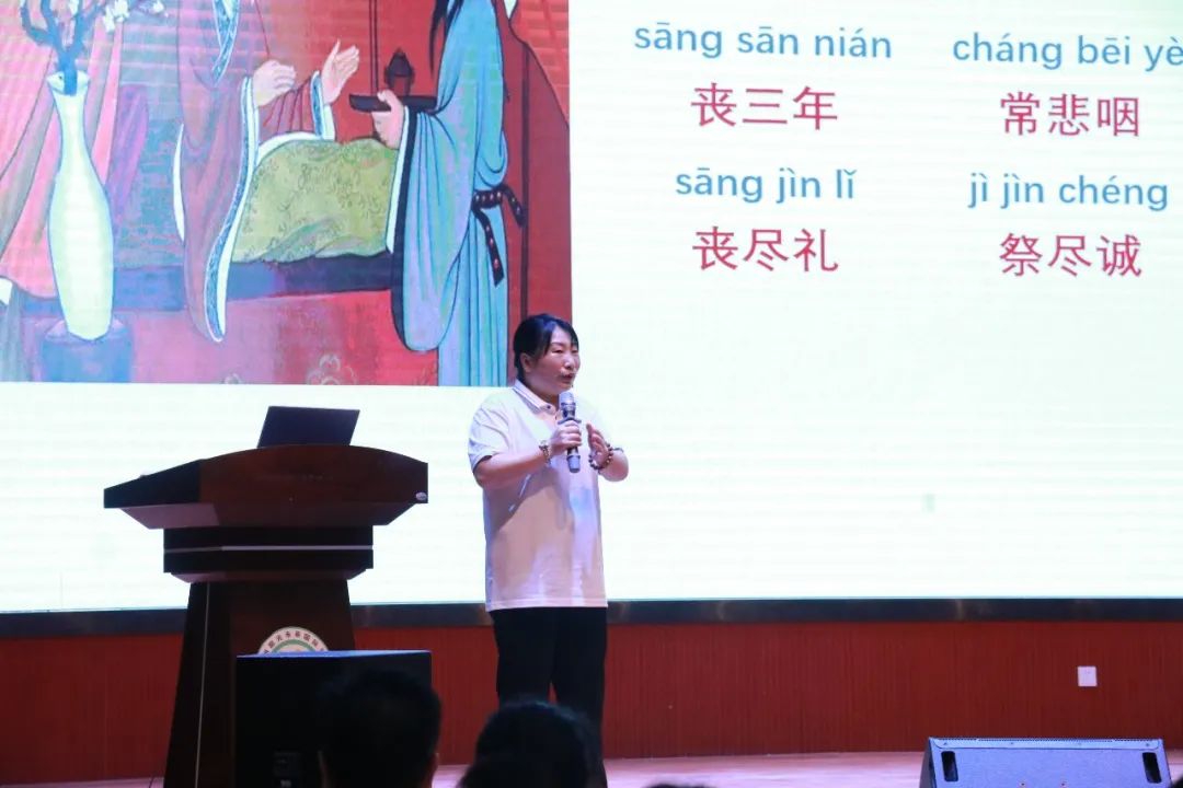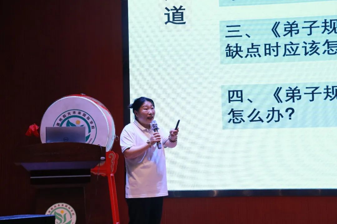 李紅測,英語專業(yè)八級,本科學歷,畢業(yè)于河北師范大學,教齡7年,德育先進工作者,所帶畢業(yè)班英語中考成績優(yōu)異,輔導學生多次在省級競賽中獲獎,本人多次獲優(yōu)秀輔導教師稱號。曾獲得河北省“希望之星”英語大賽二等獎;河北省特長生大賽本科A組演講一等獎;河北省英漢口譯大賽二等獎;河北師范大學課例研修優(yōu)秀個人。曾經(jīng)任教于泰國孔子學院,從事中英泰三語教學,具有三語教學經(jīng)驗,汲取了國外的教學模式。獲泰國教育部民校教育委員會特別貢獻獎;被孔子學院總部評2017年泰國東部片區(qū)優(yōu)秀骨干教師稱號。 教育箴言:每個孩子都是一粒種子,我愿做陽光,給他們溫暖,喚醒他們沉睡的心靈。 提升專業(yè)素養(yǎng) 德州陽光未來國際學校以國學立校,非常注重對中國優(yōu)秀傳統(tǒng)文化的傳承和發(fā)揚,《弟子規(guī)》是一部非常經(jīng)典的國學文化典籍?!兜茏右?guī)》原名《訓蒙文》,主要列舉了為人子弟在家、外出,待人、接物、處世、求學時應有的禮儀規(guī)范。書中蘊含著教人為人處世的各項準則,包含了許多教育意義的道理,對于培養(yǎng)學生的良好習慣具有很好的啟蒙及引導作用。在陽光未來國際學校的校園里,學生們人人都學《弟子規(guī)》,人人都會背誦《弟子規(guī)》。在教師業(yè)務專題培訓中,《弟子規(guī)》同時也作為了一項重要的教師培訓內容。并由國學教師趙軍老師為教師們進行培訓。