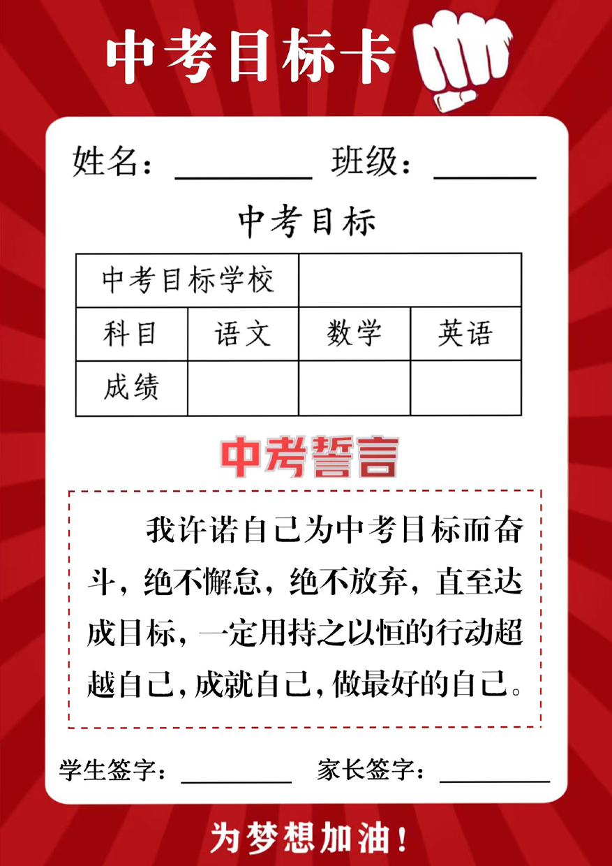 為了明確同學(xué)們的目標(biāo),老師現(xiàn)場給各班同學(xué)發(fā)下目標(biāo)誓言卡,讓家長和同學(xué)們一起進(jìn)行填寫,寫下自己的目標(biāo)成績,寫下自己將要考入的學(xué)校,并定出自己的實(shí)施計(jì)劃。 同學(xué)們誓言錚錚,撼動心靈,響徹云霄!帶著父母的期盼,老師的教誨,學(xué)校的厚望,相信同學(xué)們會銘記誓言,付諸行動! 修我戈矛,與子同袍!老師,會給你們堅(jiān)強(qiáng)的臂膀;家長,會給你愛的海洋;母校,會引領(lǐng)你揚(yáng)帆起航!同學(xué)們所要做的,就是厲兵秣馬,發(fā)奮圖強(qiáng)!