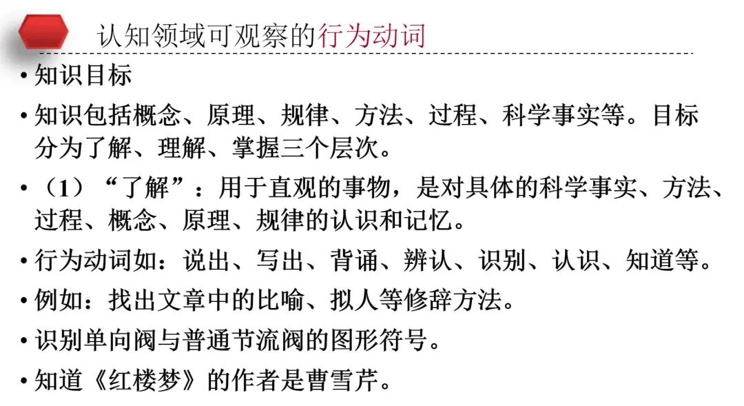 金穎主任細(xì)致的總結(jié)出認(rèn)知領(lǐng)域可觀察的行為動(dòng)詞并舉例說明,帶領(lǐng)老師更加精細(xì)的將教學(xué)目標(biāo)進(jìn)行拆解重組并優(yōu)化。
