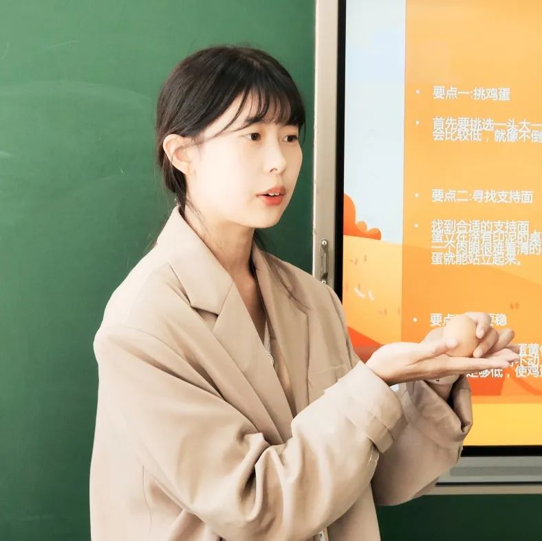孩子們把一顆顆精美的雞蛋小心翼翼地立在桌子上,聚精會神地和雞蛋“對話”。想要把雞蛋立成功,除了需要一定的物理知識,還需要靜下心來,耐心地尋找雞蛋和桌子的平衡點(diǎn)。