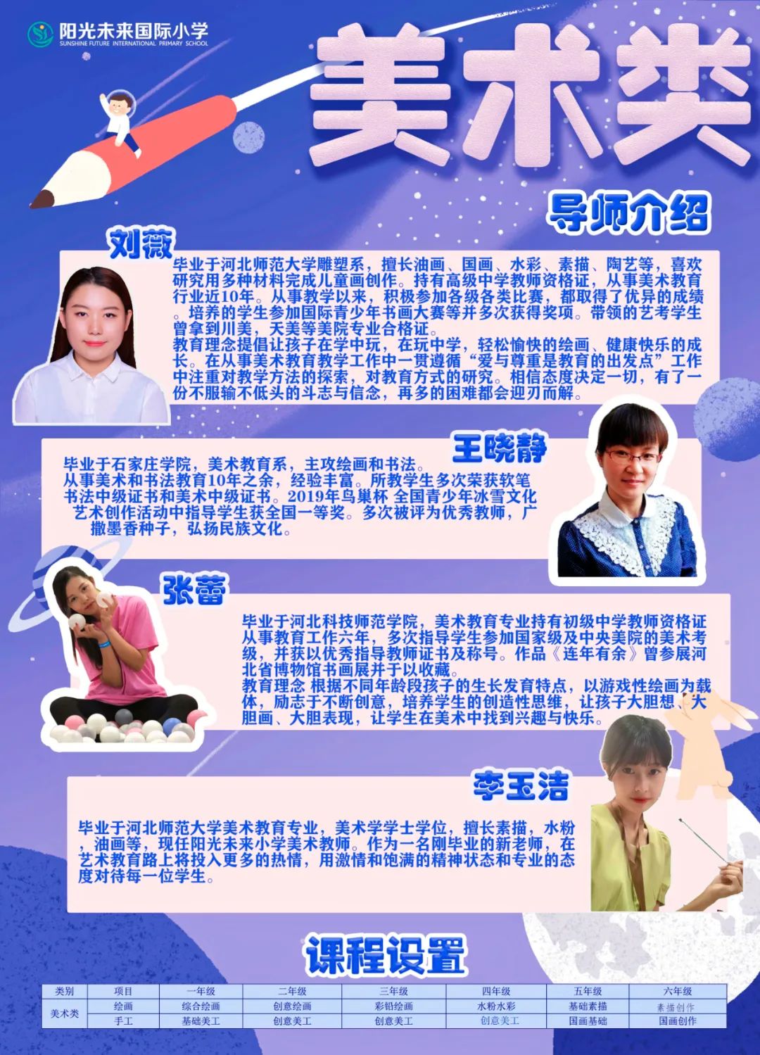 陽(yáng)光未來(lái)美術(shù)教研工作,嚴(yán)格按照教育部新制定的《義務(wù)教育小學(xué)藝術(shù)教育新課程標(biāo)準(zhǔn)(2022年)》要求,以學(xué)科教學(xué)新大綱、新教材為基礎(chǔ);以教科研為先導(dǎo),努力提高教師自身的素質(zhì)。