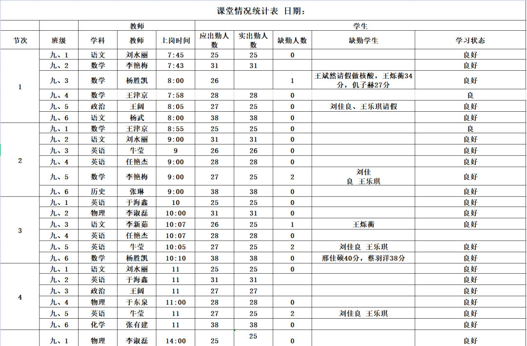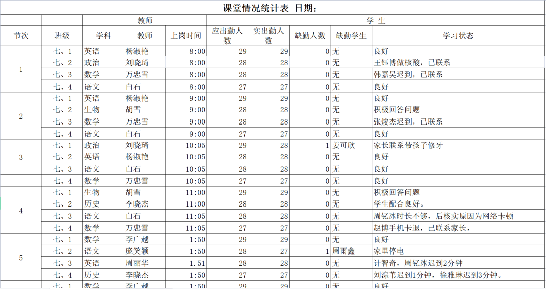 ▲九年級(jí) 1. 任課教師每節(jié)課后對(duì)學(xué)生出勤、聽(tīng)課、互動(dòng)等情況都要填寫(xiě)課堂記錄單報(bào)給班主任。 2.班主任對(duì)本班學(xué)生的學(xué)習(xí)狀態(tài)進(jìn)行日匯總,再把出現(xiàn)的問(wèn)題反饋給家長(zhǎng),取得家長(zhǎng)的配合。 3、年級(jí)組長(zhǎng)根據(jù)班主任的記錄匯總后報(bào)給學(xué)部和學(xué)校業(yè)務(wù)部門。密切的合作能督促全體學(xué)生參與到學(xué)習(xí)中來(lái)。 二、適當(dāng)安排體、音、美活動(dòng)課。 上、下午各有一次20分鐘的大課間。這樣既能減輕學(xué)生對(duì)網(wǎng)課學(xué)習(xí)的枯燥感,有能增強(qiáng)體質(zhì)緩解疲勞。 三、實(shí)施備課組線上集體備課。 教師們把正常的每日集體備課轉(zhuǎn)到線上進(jìn)行,同組教師認(rèn)真討論課程的進(jìn)度、重難點(diǎn)、學(xué)習(xí)目標(biāo)、題型等具體問(wèn)題,形成統(tǒng)一的課堂教學(xué)方案,保證了直播教學(xué)的有效性。